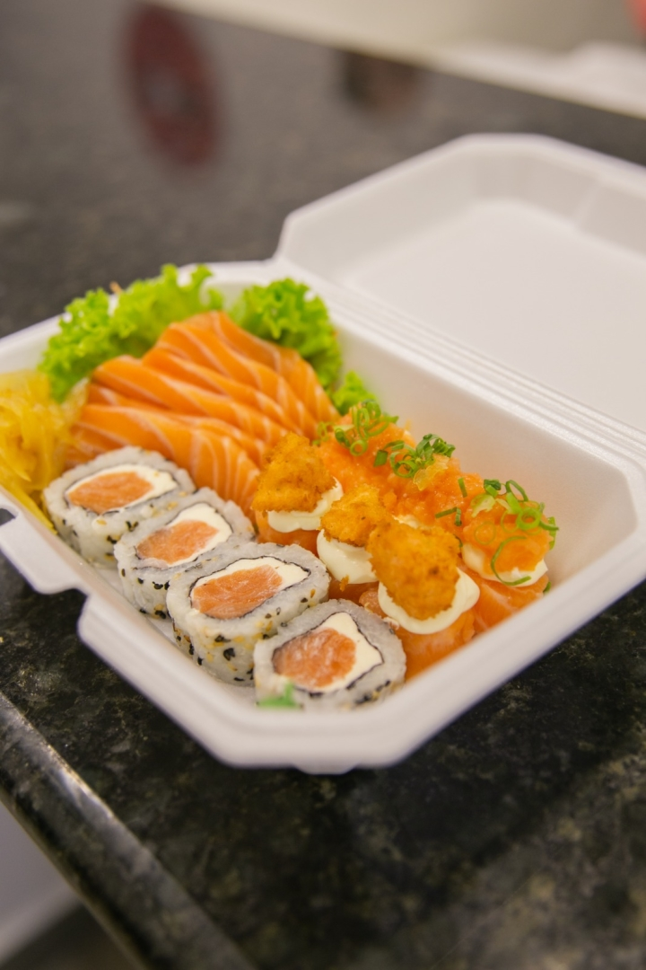 03 Joes de Salmão,03 Joes Crocante, 04 Uramakis de Salmão e 06 Sashimis de Salmão.