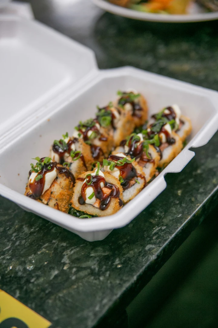 Hot roll na massa de pastel com recheio de salmão grelhado, skin, cream cheese, kani, tomate seco e molho de laranja.